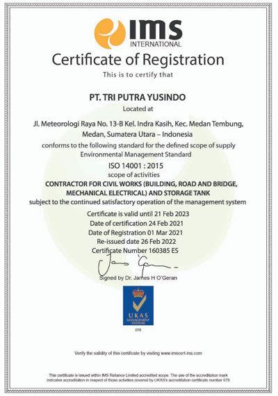 Perusahaan memastikan jaminan kualitas berdasarkan standar internasional seperti ISO 9001-2015-Quality Management System, ISO 14001-2015-Environment Management System dan ISO 45001-2018-Health and Safety Management System.