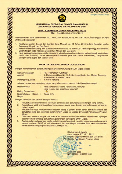 PT. Tri Putra Yusindo sangat berpengalaman dalam Pembangunan Tangki Timbun (Storage Tank), Pabrik Kelapa Sawit (PKS), Pergudangan, Pekerjaan Struktur Baja, Pekerjaan Pipa (Piping), Pekerjaan sipil (kantor, perumahan, dll), Elektrikal dan Machining.