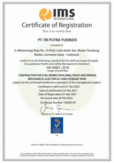 Perusahaan memastikan jaminan kualitas berdasarkan standar internasional seperti ISO 9001-2015-Quality Management System, ISO 14001-2015-Environment Management System dan ISO 45001-2018-Health and Safety Management System.